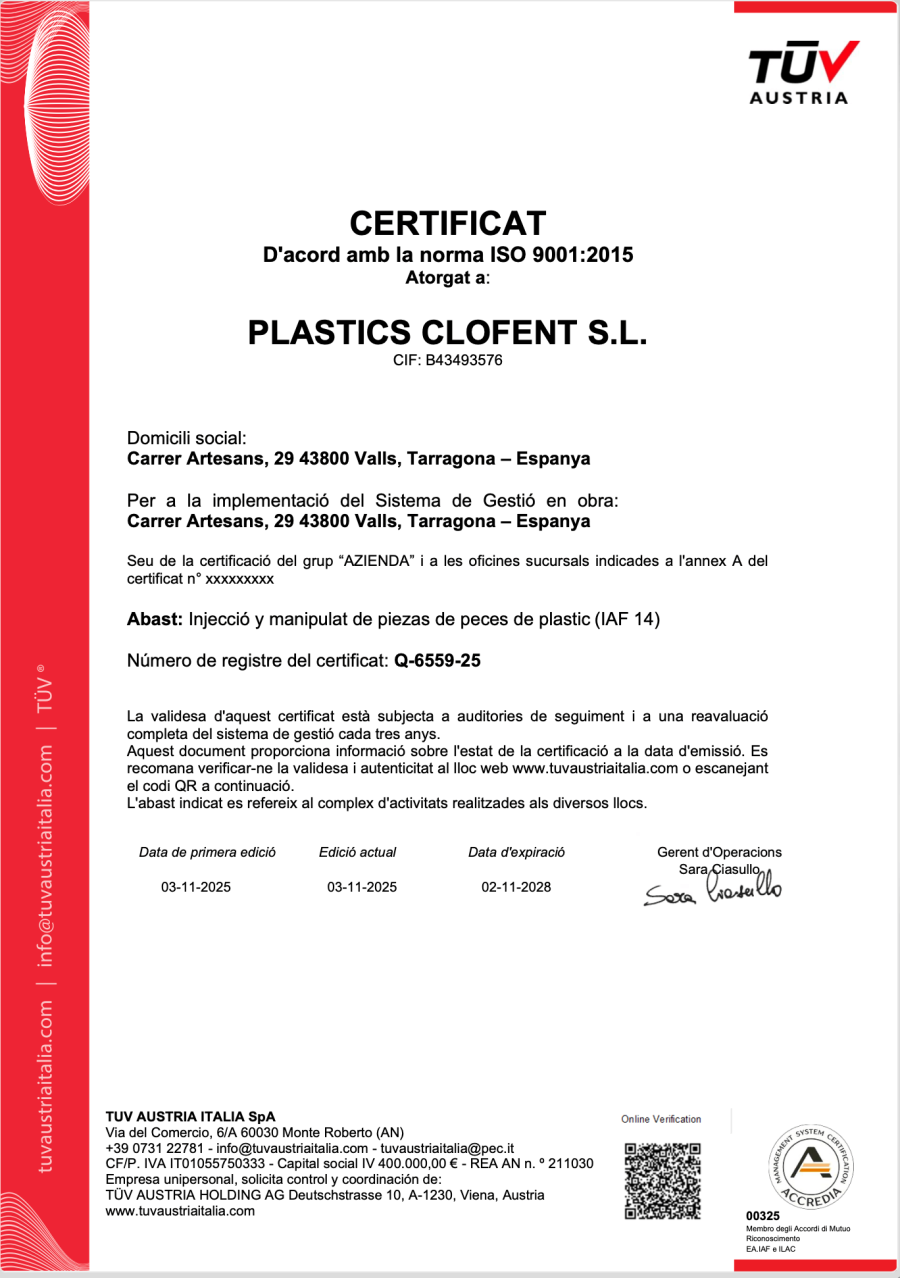 La nostra activitat es desenvolupa sota un Sistema de Gestió de la Qualitat certificat segons la norma ISO 9001:2015, que garanteix processos controlats, eficients i orientats a la satisfacció del client. Aquest certificat no és només un segell, sinó el reflex d’una manera de treballar basada en la responsabilitat, la transparència i l’orientació al client.
